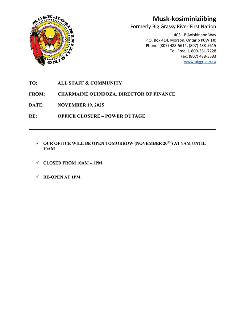 Please ensure that you provide as much information as requested. We encourage you to advise and share with your family members to access this much needed Holiday assistance. It is set as an application based assistance so please ensure the forms are filled out and sent to the email bgfnadmin@biggrassy.ca or hand delivered to 403 B Anishinabe Way or faxed to 807 488 5533.