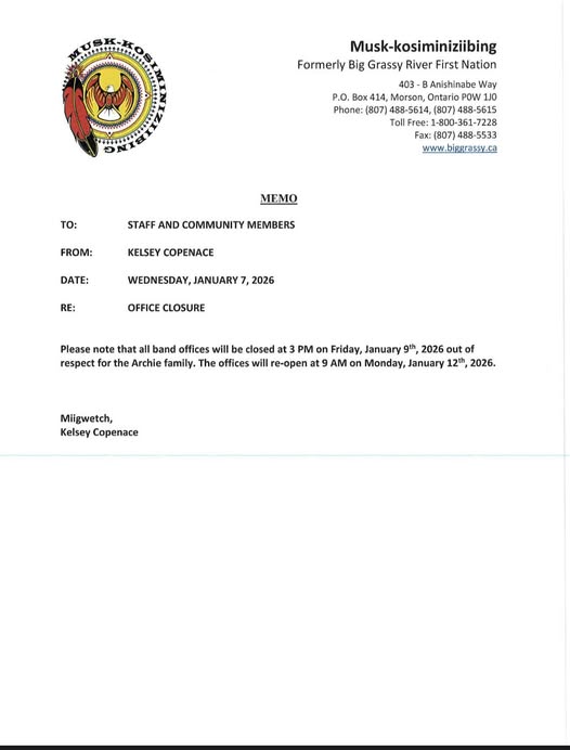 Mishkosiminiziibiing (Big Grassy River) is an Ojibway community of 276 residents in Northwestern Ontario, located on the southeast shores of beautiful Lake of the Woods. Big Grassy River First Nation is part of the Grand Council Treaty #3 Tribal Organization.
