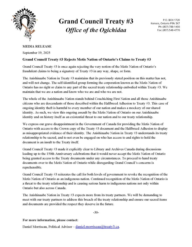 GCT#3 REJECTS METIS NATION OF ONTARIO’S CLAIM TO TREATY #3