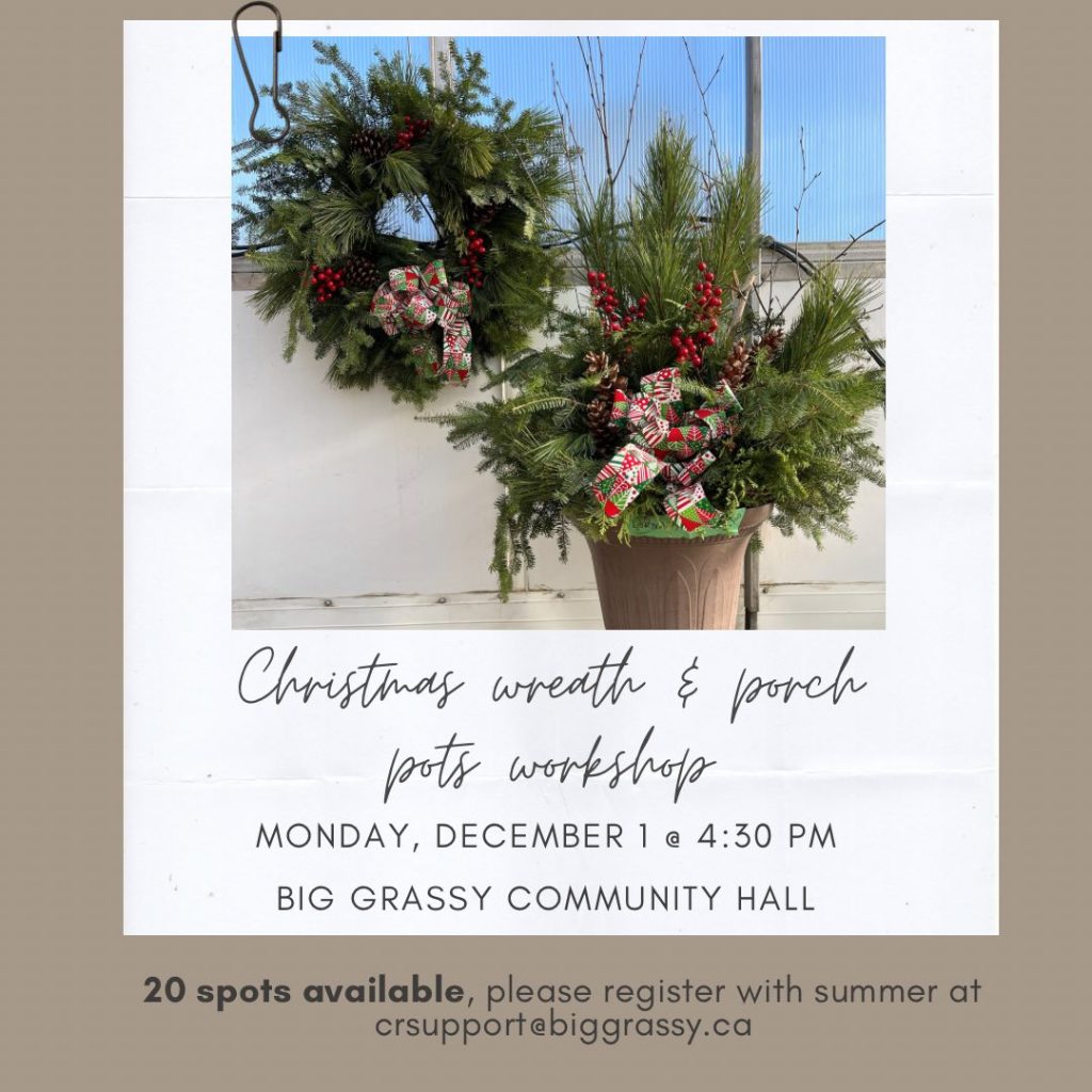- Mon 12/1/2025: XMAS WREATHS & PORCH POT WORKSHOP - DECEMBER 1st - 4:30pm - View Poster on News & Events Page