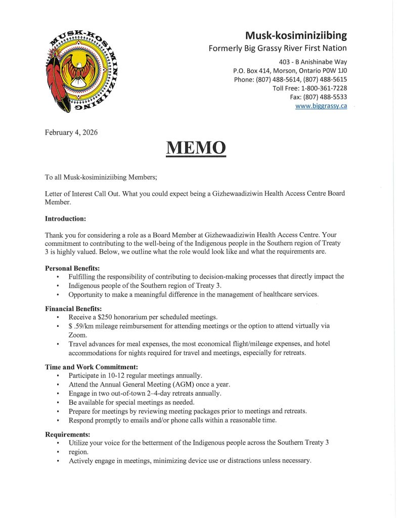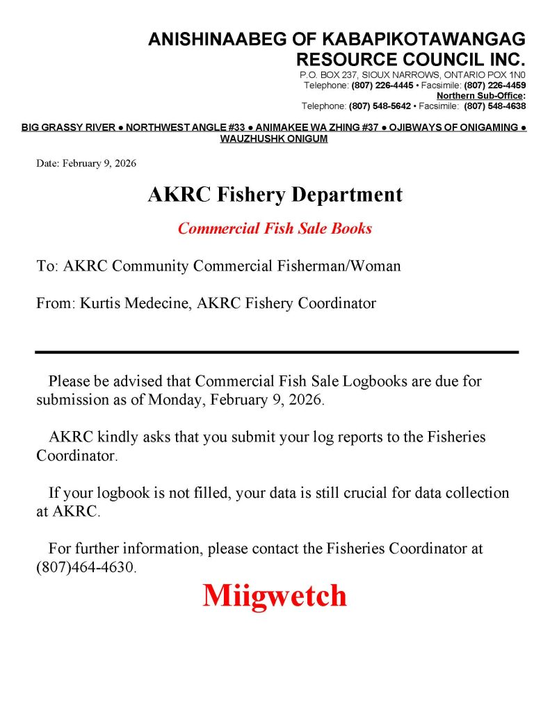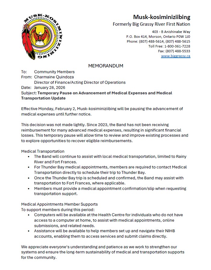 - Tue 1/6/2026: MUSK-KOSIMINIZIIBING PREVENTION TEAM PRESENTS 2026 ICE FISHING CHALLENGE January 6 - March 23, 2026 For info contact Travis: landbasedcoordinator@biggrassy.ca